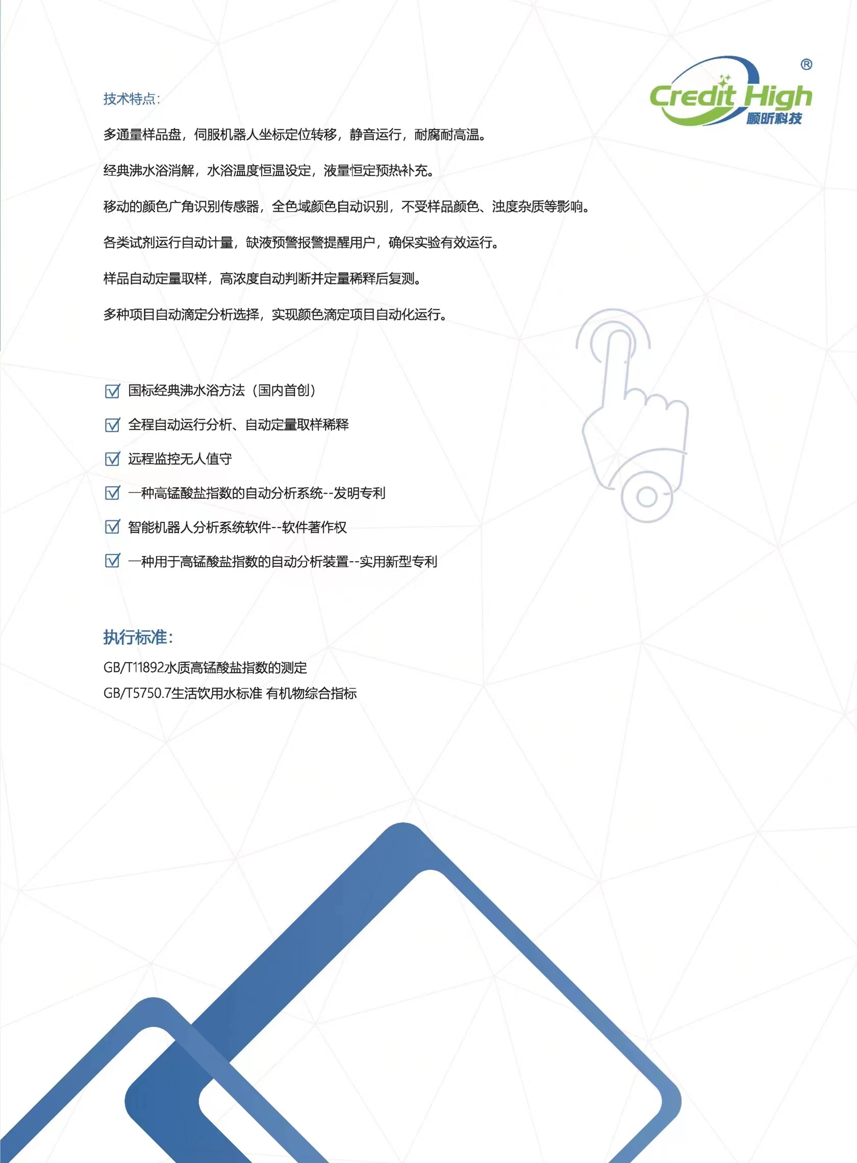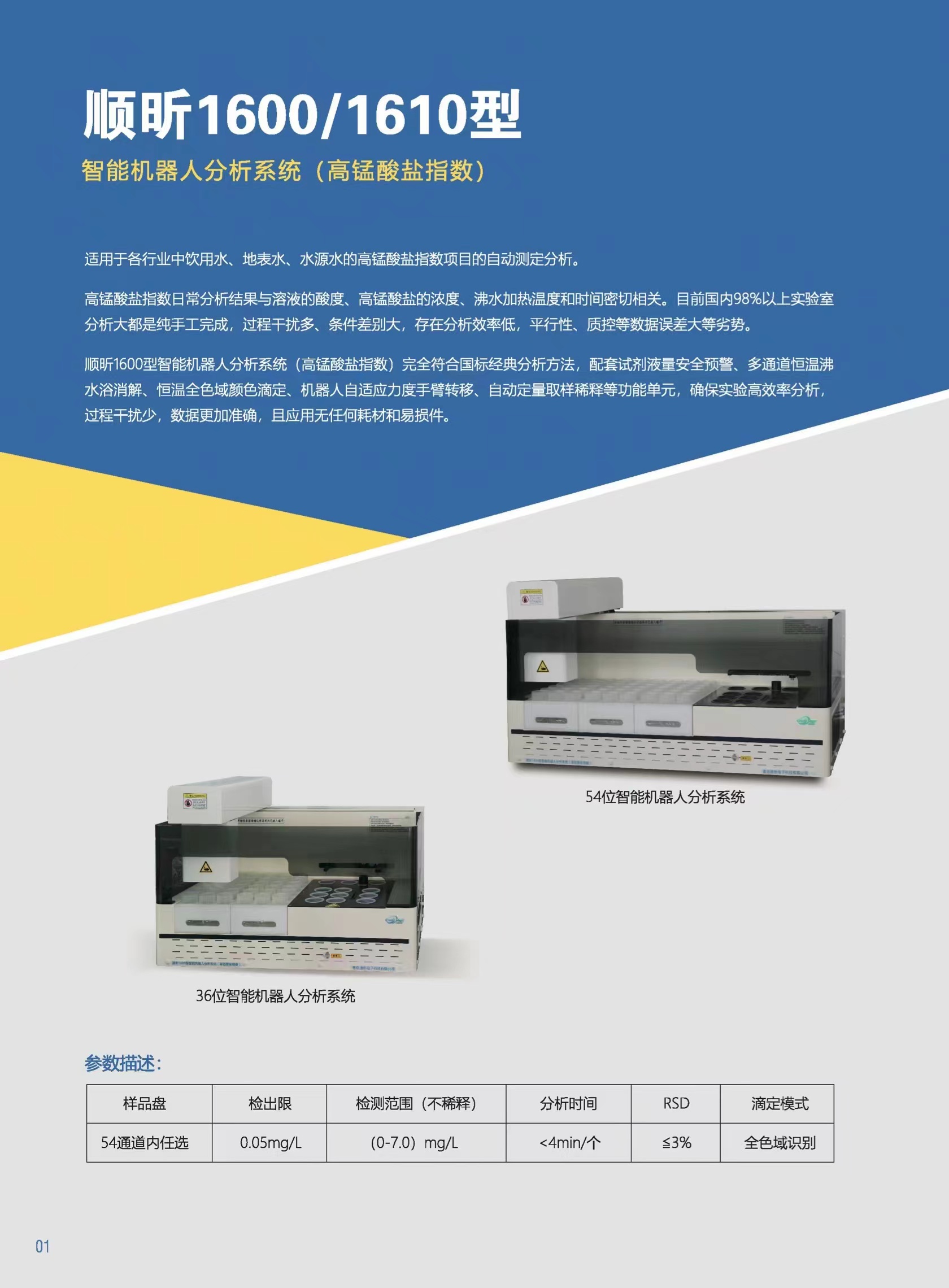 顺昕1600型智能机器人分析系统(高锰酸盐指数)完全符合高锰酸盐指数国标经典方法,配套试剂液量安全预警、多通道沸水浴加热、恒温颜色滴定、机器人手臂转移、自动定量取样稀释等功能单元,确保实验效率高,过程干扰少,数据更加准确,且应用无任何耗材和易损件。 适用于各行业中饮用水、地表水、水源水的高锰酸盐指数项目的自动测定分析。